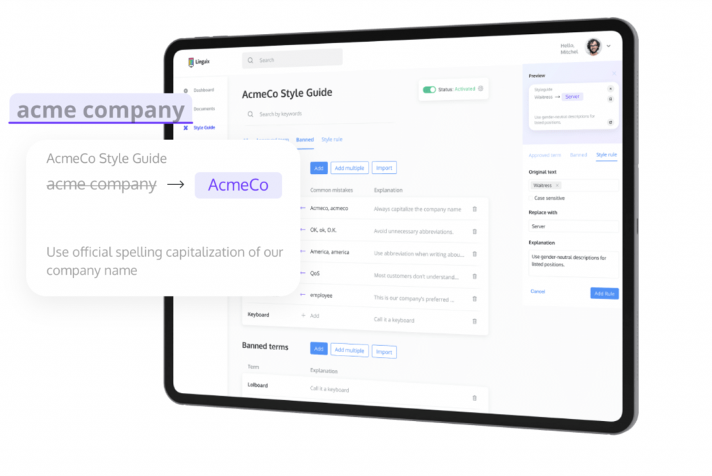 - One client in the IT industry used Linguix Style Guides to deter its employees from using the word “digitalization” to avoid sounding distant and too corporate.