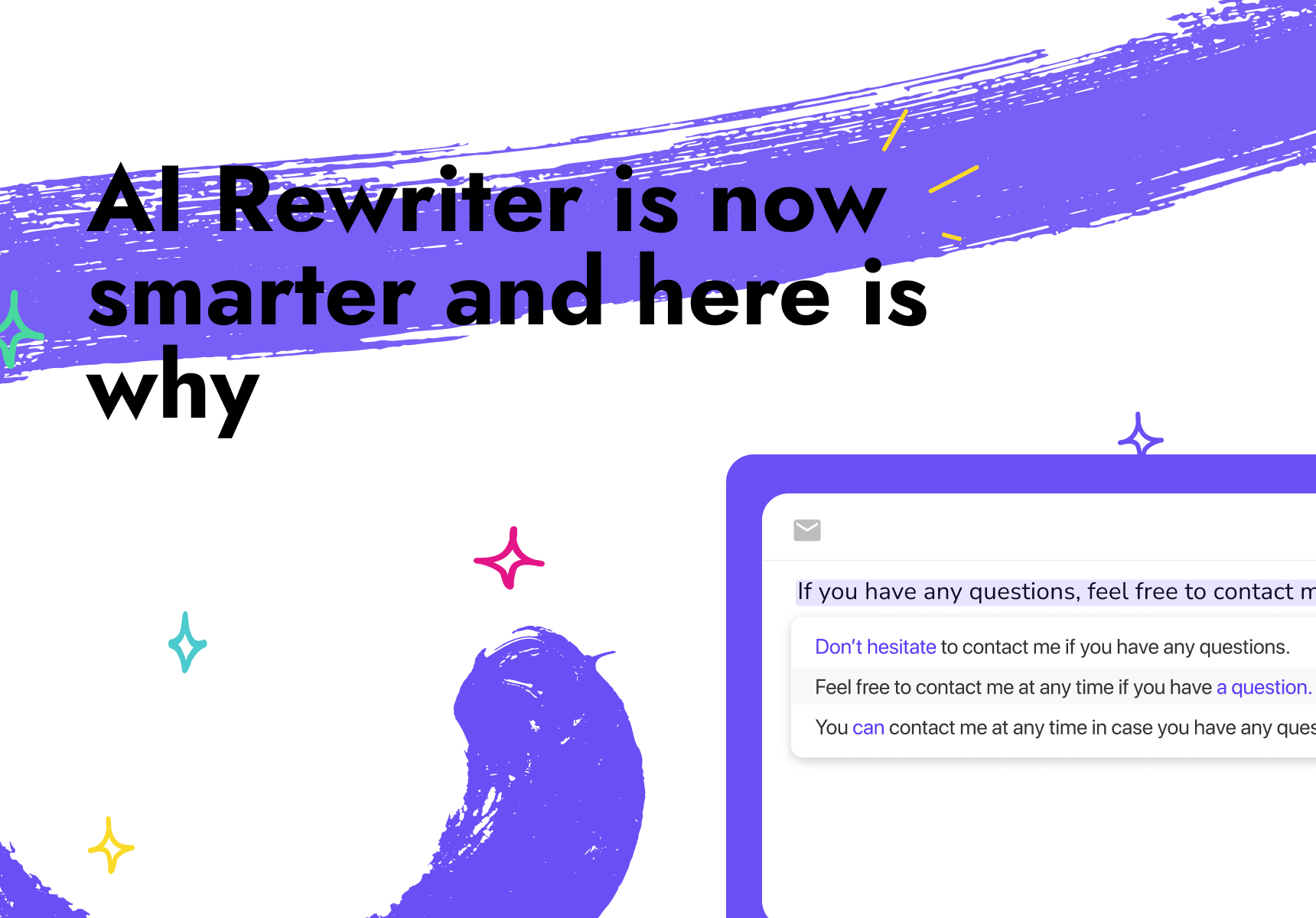• You can deeply focus on your thoughts and the value you provide while writing. Without the rewriter, you’d be interrupted with your own thoughts about more suitable synonyms or ways to enhance your copy.